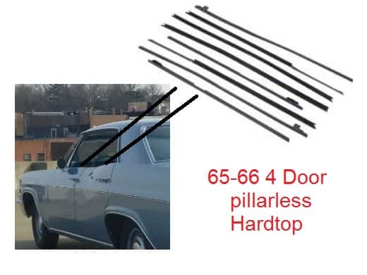 This is an 8 piece Kit.... a full Original Equipment Type inner and outer set of Window Felts for the Impala, Parisienne, Catalina & Bonneville 4 door Pillarless sedan.