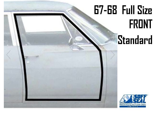 Front pair of POST SEDAN or Wagon door weather seals with clips and molded ends. This Standard Soffseal set is for: 1967 - 1968 Full Size FRONT 4 Door sedan (post sedan) FRONT DOORS.. a matched pair.. for the PILLARED sedan ONLY.