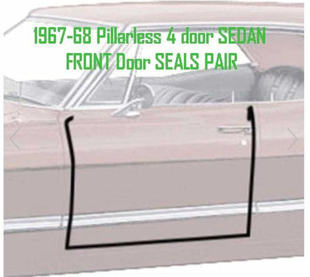 This FRONT set is for a PAIR of the exact door seals on the Impala or Parisienne - 4 Door FRONT - Pillarless hardtop sedan...a pair. Also fits Bonneville and Olds of the same body shape. Each seal is specifically LH or RH.. and made with the correct pins and locators as needed.. as per factory original.