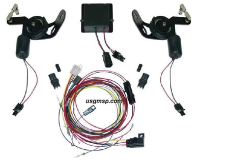 The kit comes complete with everything needed for installation including two electric actuators, a control module, harness, mounting brackets, and hardware.