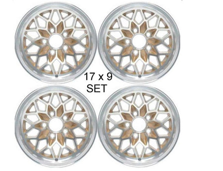 17" X 9" version of the "Snowflake" wheel that came as part of the WS6 option package on 1977-1981 Trans Am models. Gold painted recesses and clear coated as original. Accepts original style center caps and lug nuts (not included).