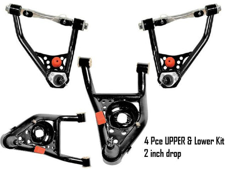 New Complete front control arm set with ball joints and polyurethane bushing, bump stops, in aftermarket TUBULAR design for custom car building. These are NOT factory so subject to rego rules or engineer needs. ONE set in stock only at this price Nov 2025. Delivery additional Nation wide. Phone or email if time critical. The lowers allow for 2 inch drop and you will use the same std coil springs as factory.