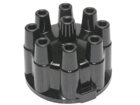 This distributor cap for early Chevy models (1951-1956) features retention via two side clips attached to the distributor, unlike later designs where the cap includes built-in retention. It fits original GM Chevrolets from that era, is compatible with various Accel performance distributors, and is commonly found on vintage street rods.
