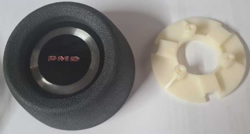 New Horn cap and insulator as shown in black Specifically or the 69-70 wood steering wheel. featuring the black soft horn cap with the PMD center emblem as shown for the Pontiac Firebird & GTO/ Le Mans.
