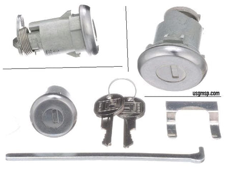 This boot and trunk lock kit includes the keyway rod U clamp and keys, featuring a chrome outer cap. It is compatible with a wide range of GM vehicles from the 1961 to 1980 era.