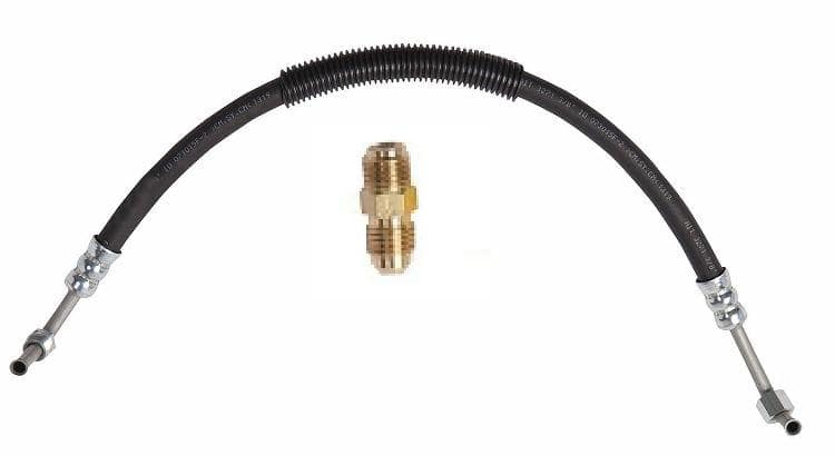 NOTE THIS COMES WITH A MALE/FEMALE steering box fitted joiner joiner as shown..(we have enlarged the joiner graphic to help you see it) You may NOT need it.. or it may be in the box already and you did not notice OR you chucked away the old box and now with a new box.. the bloody hoses don't fit. All Those cases have happenned and we cop the blame.. .. so just be aware of this senerio please.. check..
