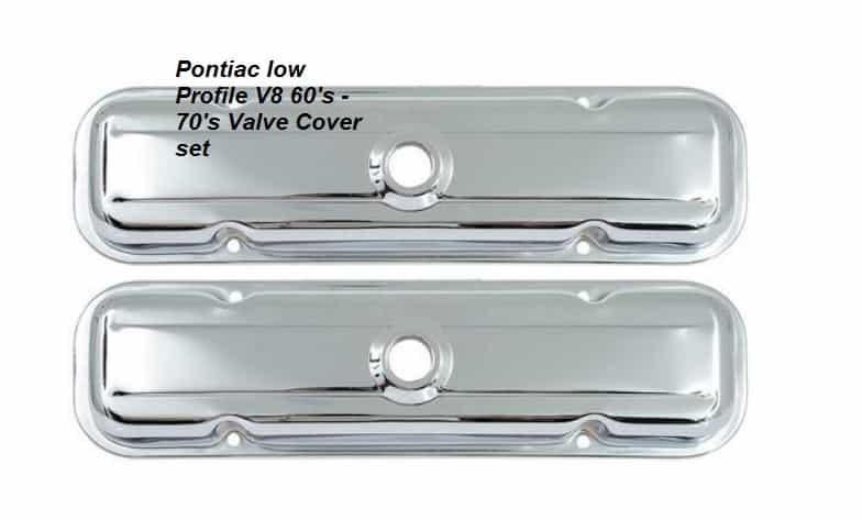 This set includes high-quality chrome tin valve covers designed in a factory style with four-bolt mounting. Specifically intended for standard height applications on US Pontiac V8 engines—compatible with models such as GTO, LeMans, Firebird, Catalina, Grand Am, and Grand Prix. Not suitable for Chevy or Parisienne engines.