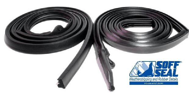 These Standard reproduction ROOF RAIL weather seals, manufactured outside the USA, known as imports..., extend from just above the upper front door hinge, along the pillar, over the door glass, and down to the door. This set includes a pair of seals complete with retainers.