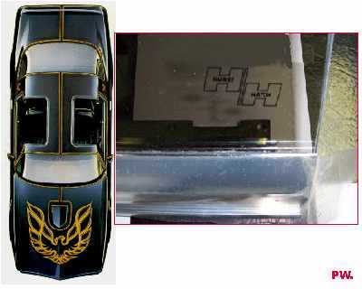- Hurst Hatches are generally identified by this H/H emblem in the glass (hold up to the light and look through), and also on the back side of some plastic trim. The hatches have LOF laminated safety glass, which is date coded, and they close with two handles.