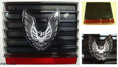 This smoked center fuel door fits 1979-81 Firebird Trans Am models, featuring a red reflector base. You can select options with or without the Silver Special Edition Bird emblem. The BIRD emblem is a separate part NOT included here & is either silver or gold.