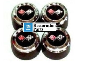 New GM Approved reproduction set of 4 Chrome Corvette wheel center caps as shown with the Black border and emblem background.